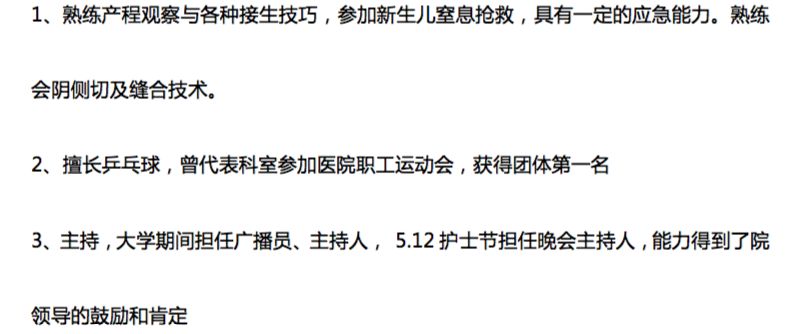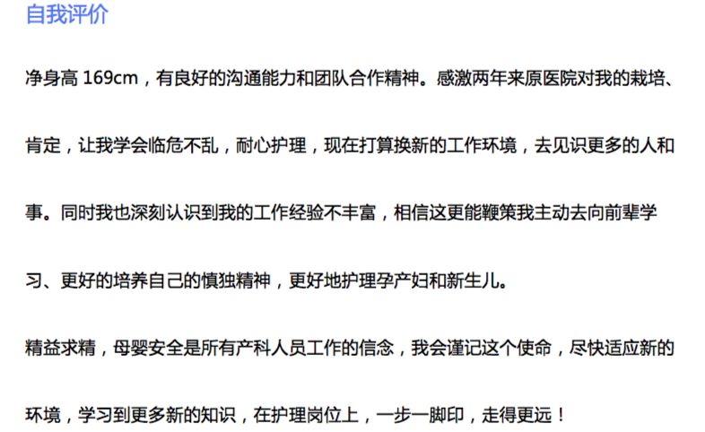 四. 自我评价方面没有展示自己的特长:很多医院愿意招收具有一定才艺的护士,如会唱歌,会一两件乐器,会跳舞,会写文案等,这在科室参加医院筹备的各种活动的时候具有一定的优势。