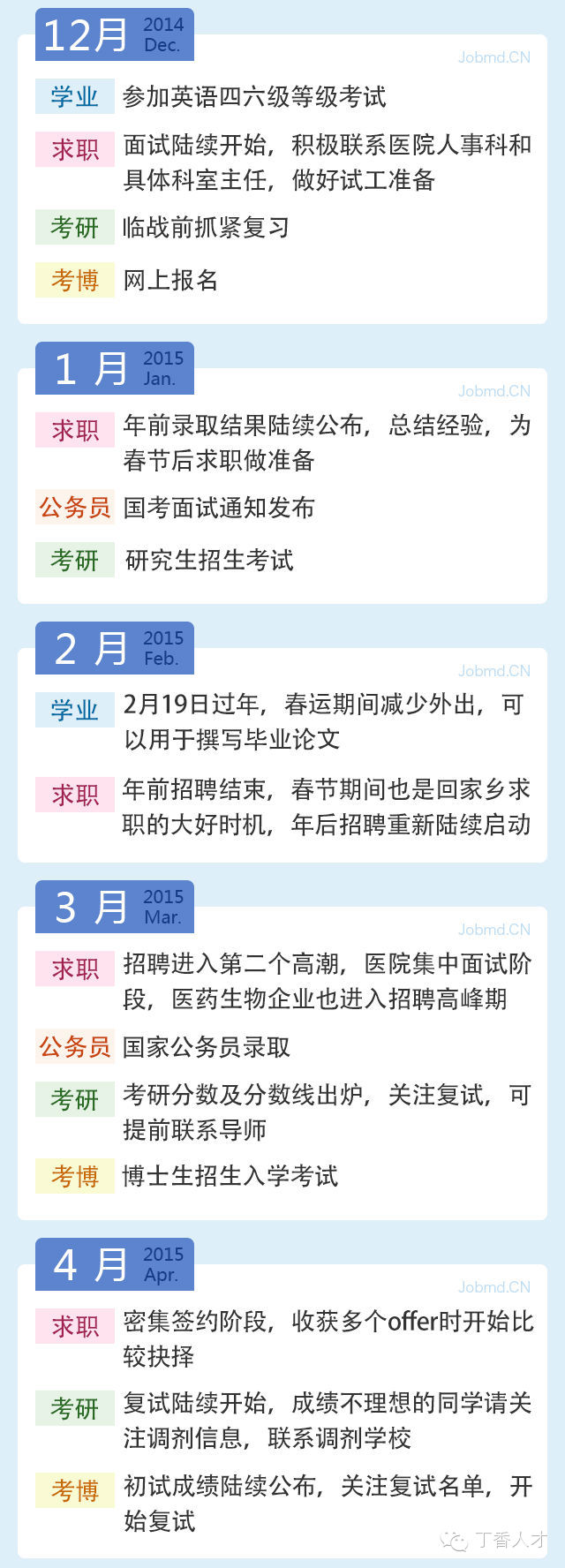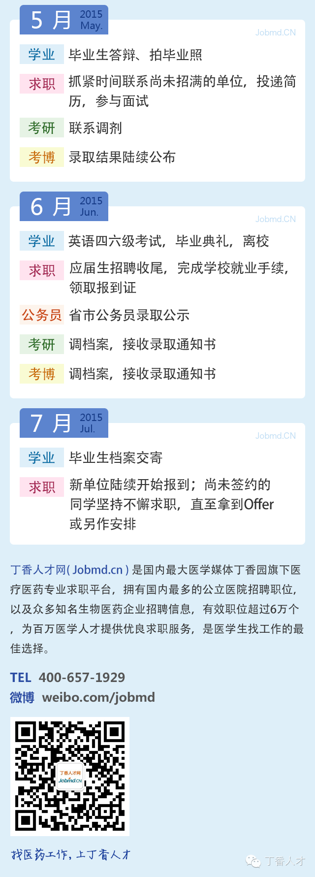 2015届医学毕业生就业月历日期:2022-06-17 来源:丁香人才公众号 以上是微信精简版,更加详细文字版本请点击“阅读原文”。丁香人才还将推出更多医学就业政策解读和求职经验技巧,欢迎持续关注。微信扫一扫分享资讯上一篇:15 年第七期「每周医药岗位推荐」专注医学求职招聘 - 丁香人才网下一篇:实力最强 | 江苏省综合实力最强的三级甲等医院招聘