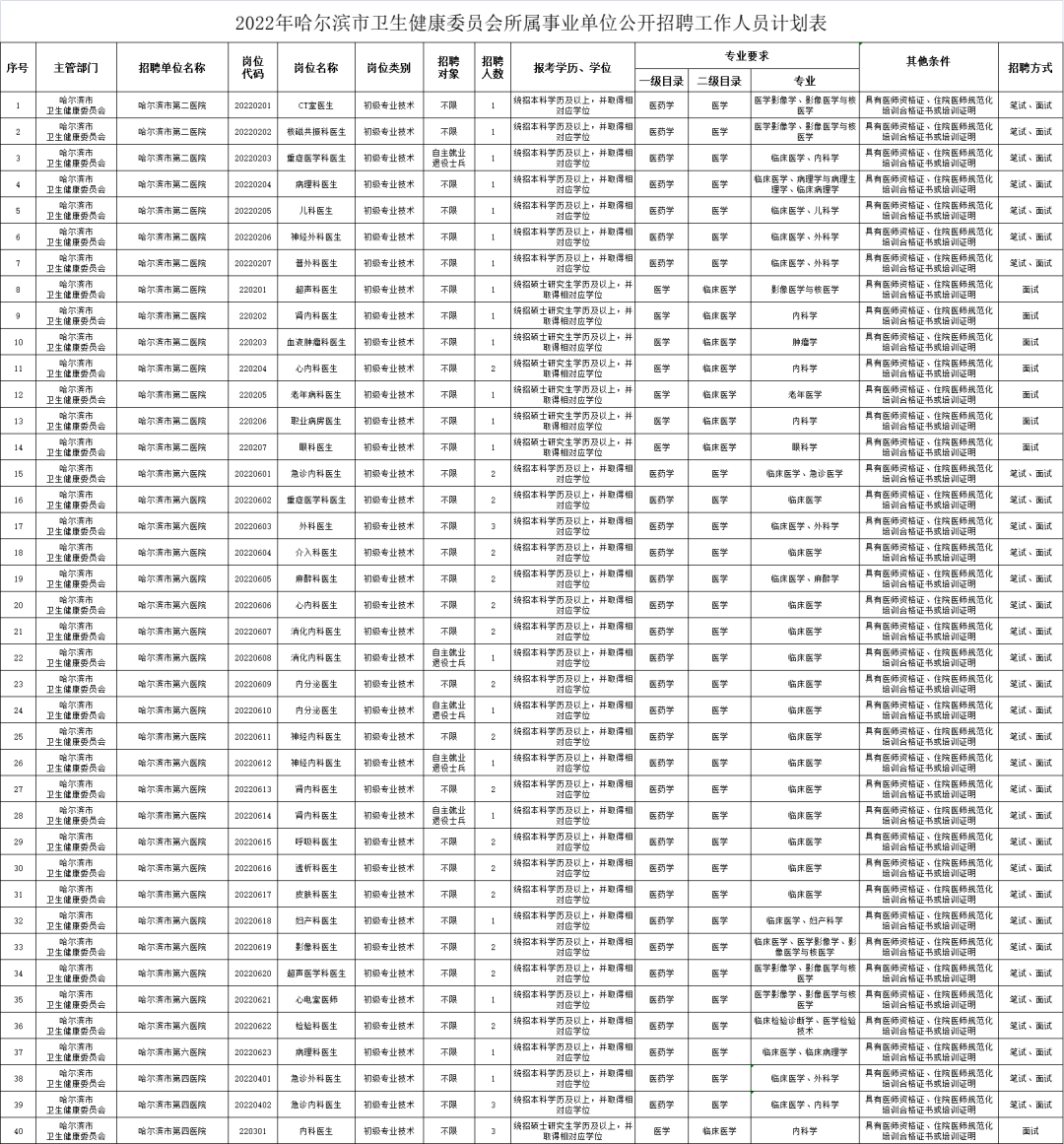 根据国家和省、市有关规定,依据《关于转发<黑龙江省事业单位公开招聘工作人员实施细则>的通知》(哈人社发〔2015〕95 号)文件精神,哈尔滨市卫生健康委员会所属 15 家事业单位公开招聘工作人员。现公告如下: