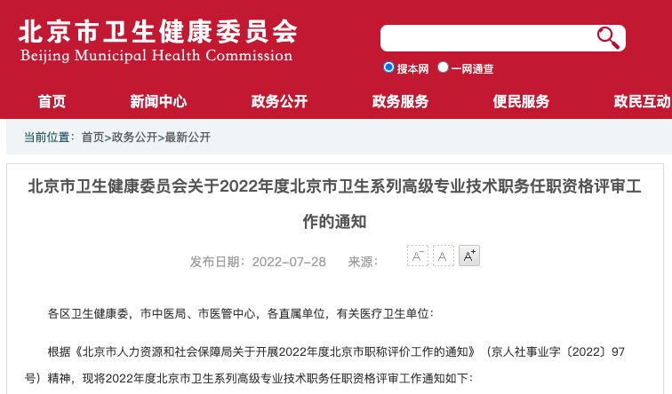 7 月 28 日,北京市卫生健康委员会发布《关于 2022 年度北京市卫生系列高级专业技术职务任职资格评审工作的通知》。