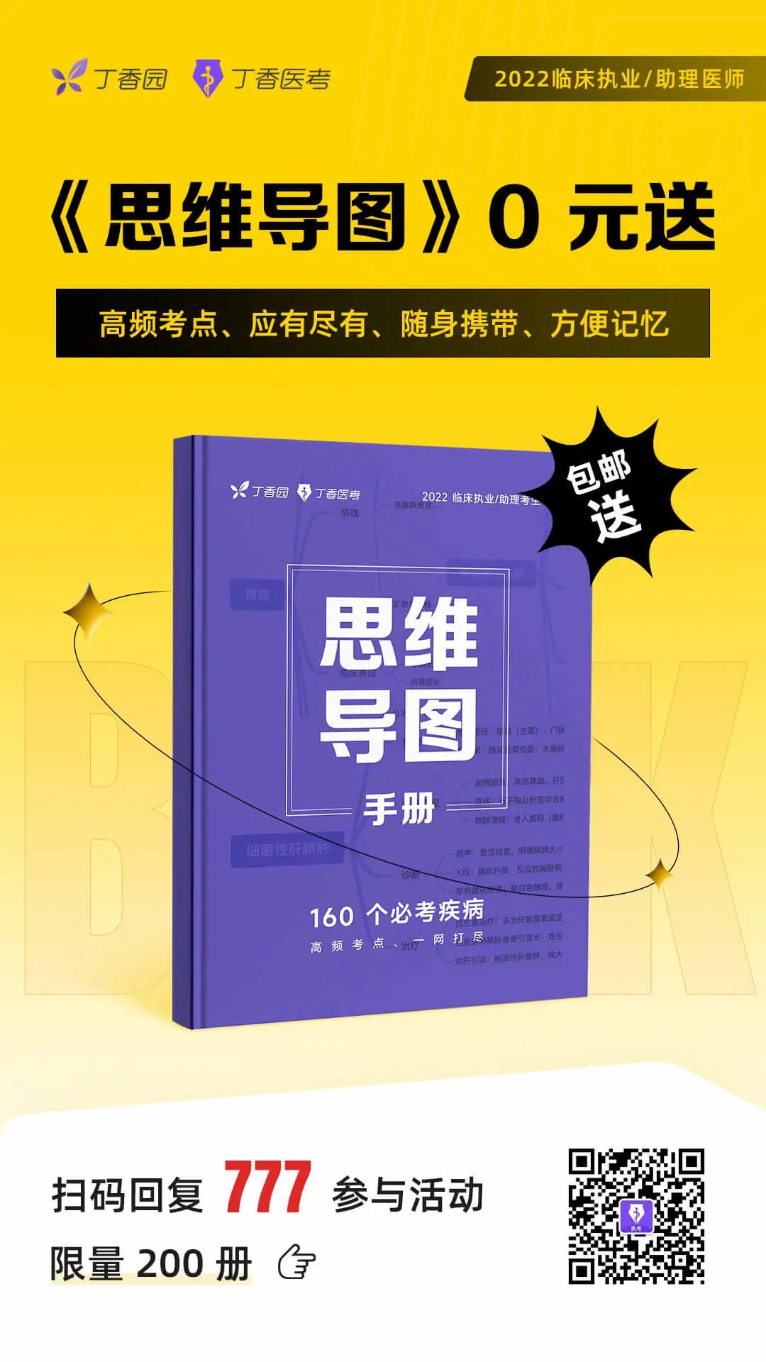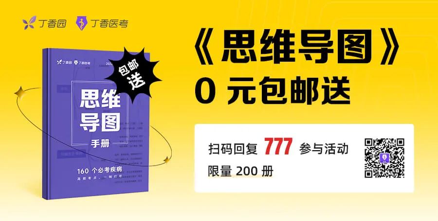 丁香医考 (丁香园旗下医考品牌) 为大家准备了丁香医考自研的《思维导图》(2022版)实体书 包邮免费 送,助力考前 20 天的强化记忆! 一周搞定 160 个每年必考疾病!