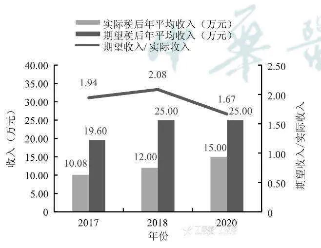 协和调查显示,2017 年、2018 年和2020 年我国医生实际税后年收入中位值分别为 10.08 万元、12.00 万元和 15.00 万元。医生期望税后年收入中位值分别为 19.60 万元、25.00 万元和 25.00 万元,医生的实际收入和期望收入之间仍存在较大差距。