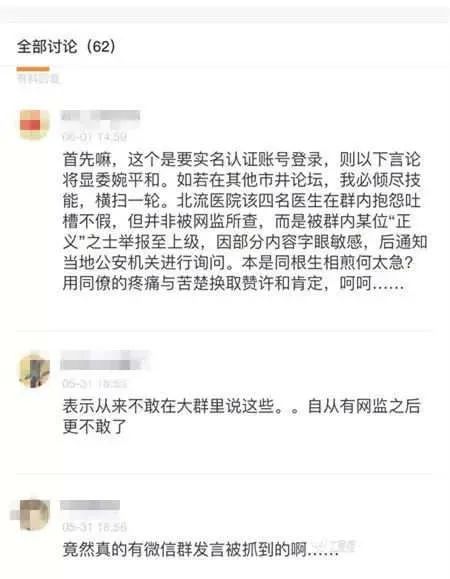 而据知情网友就此事留言跟帖称,北流医院该医院四名医生在群内抱怨吐槽不假,但并非被网监所查,而是被群内某位「正义」之士举报至上级,因部分内容字眼敏感,后通知当地公安机关进行询问。