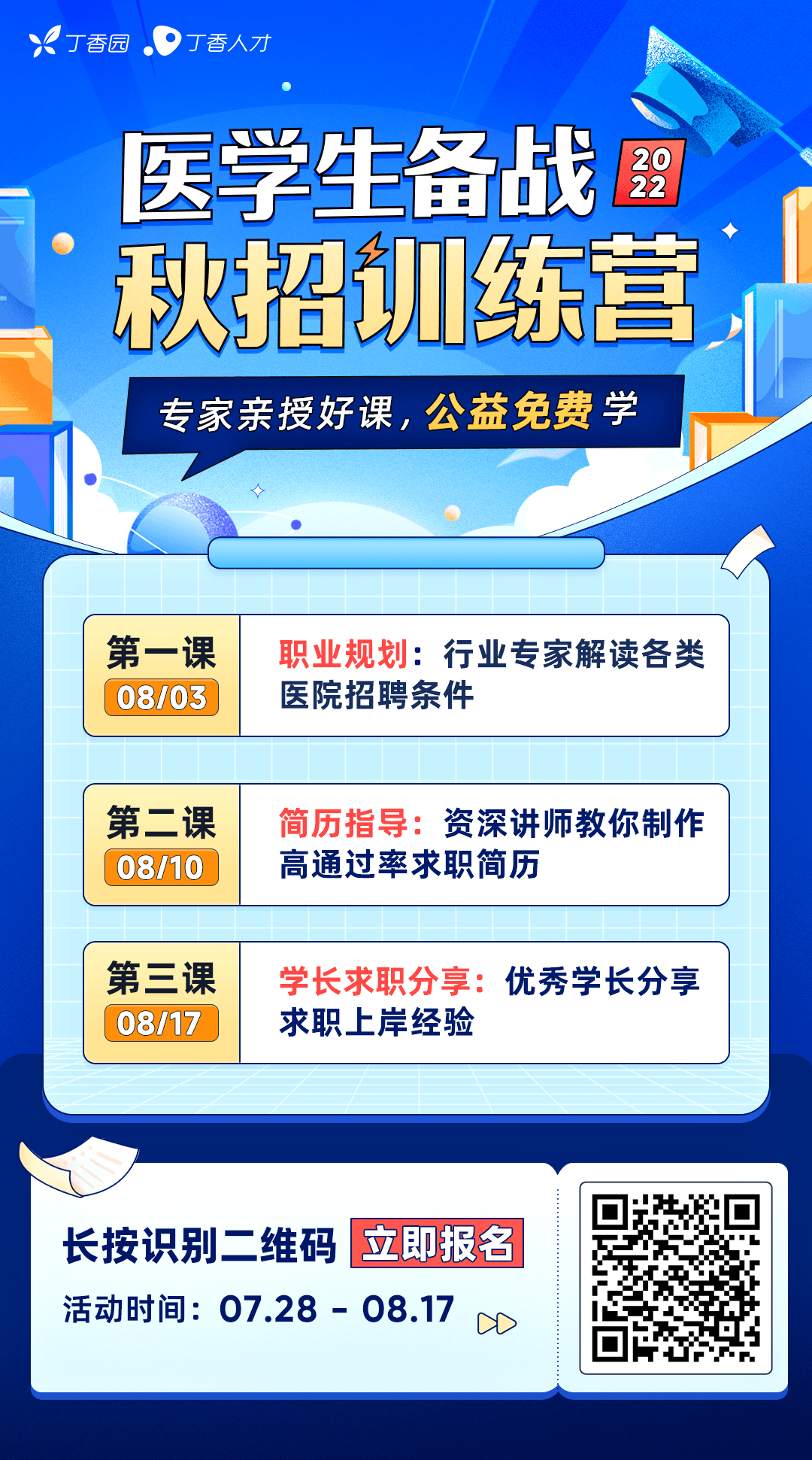 为了帮助小伙伴们高效迎战秋招,丁香人才开展了 医学 生高效备战秋招训练营 。