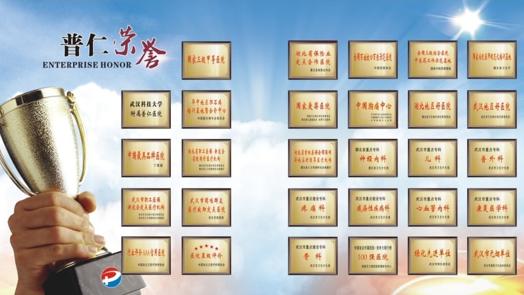 武汉市普仁医院是武汉科技大学附属医院第四临床医学院、是「全国三级综合医院中医药工作示范基地」、国家「胸痛中心」、「心衰中心」、国家「爱婴医院」,「湖北省职工医保、新农合定点转诊医院」,「武汉市文明单位」、「武汉市物价信得过单位」、「湖北省绿化红旗单位」,2015 被评为「湖北地区好医院」和「武汉地区好医院」。2017 年通过三级甲等医院评审,获得「中国医院竞争力星级认证五星级医院」,中国非公立医疗机构协会「行业评价 AAA 信用医院」,中国非公立医疗机构协会「医院星级评价五星级医院」。