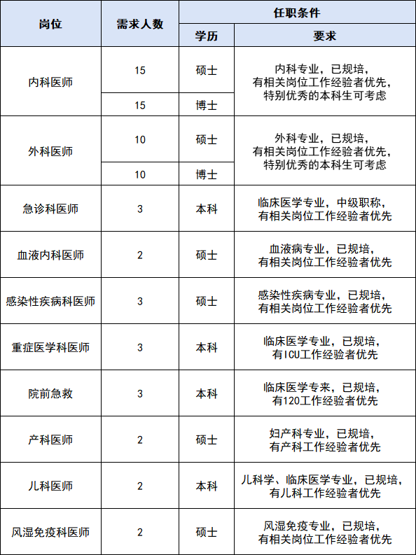 点击岗位名称即可应聘☟☟☟内科医师外科医师急诊科医师血液内科医师感染性疾病科医师重症医学科医师院前急救产科医师儿科医师风湿免疫科医师