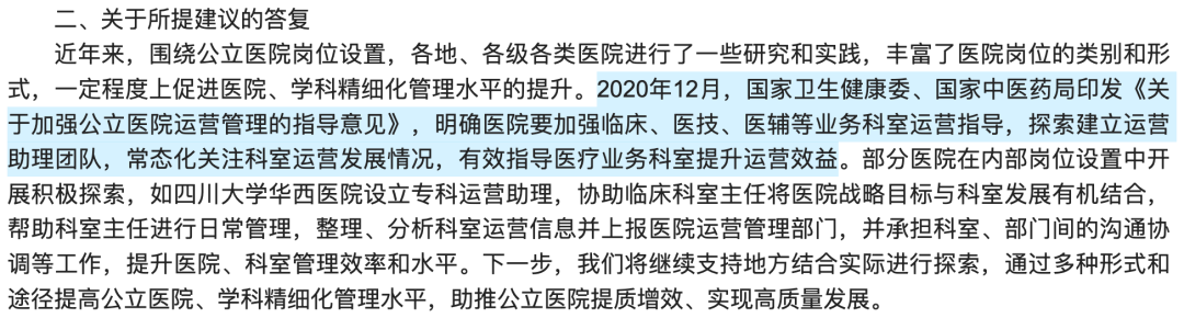 早在 2020 年,医管部门就下发文件,鼓励公立医院探索更完善的科室运营。根据卫健委的回应中提及的细节,以华西医院为例,专科运营助理的职责包括: