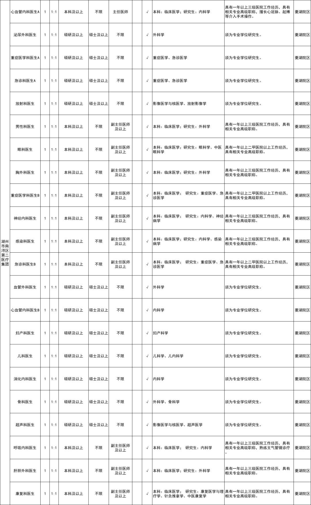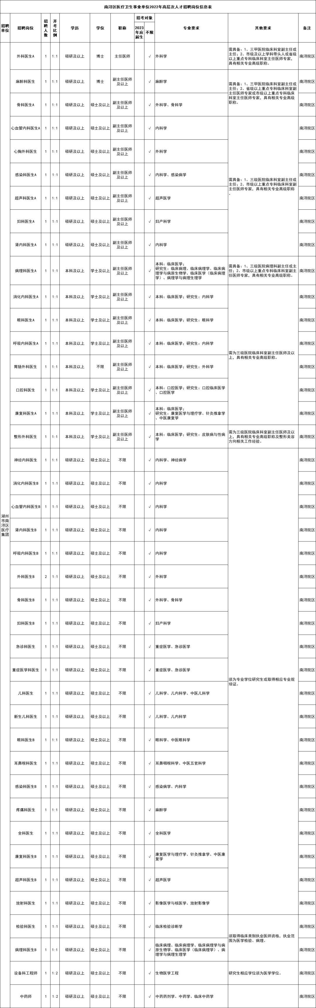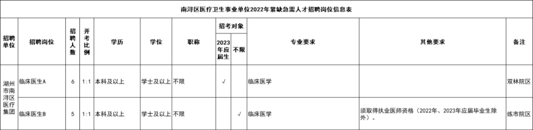 计划招聘紧缺急需卫生高层次人才 100 名 ,招聘岗位、报考专业、数量详见《南浔区医疗卫生事业单位2022年高层次人才招聘岗位信息表.xlsx》(点击下载)及《南浔区医疗卫生事业单位2022年紧缺急需人才招聘岗位信息表.xlsx》(点击下载)。