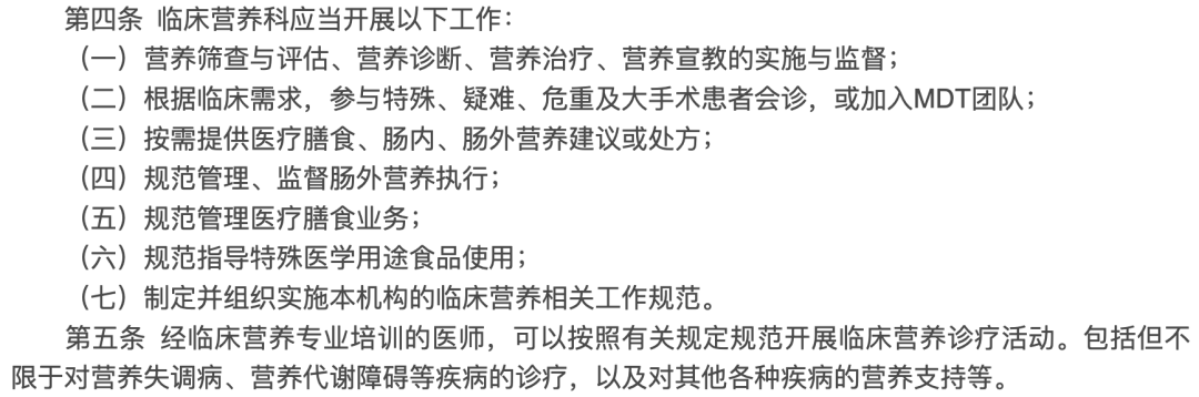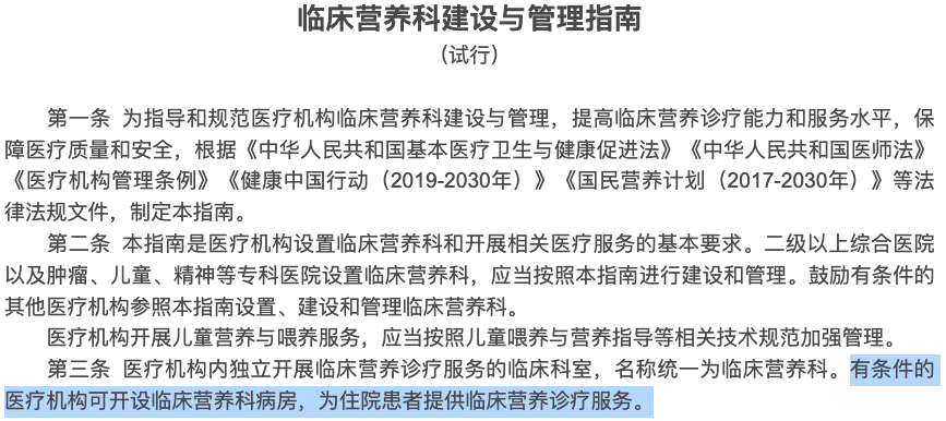 在《临床营养科建设与管理指南》中更是提及,有条件的医疗机构可开设临床营养科病房,为住院患者提供临床营养诊疗服务。这也意味着有实力的临床营养科可以迈出从辅助诊疗到负责诊疗的重要一步。