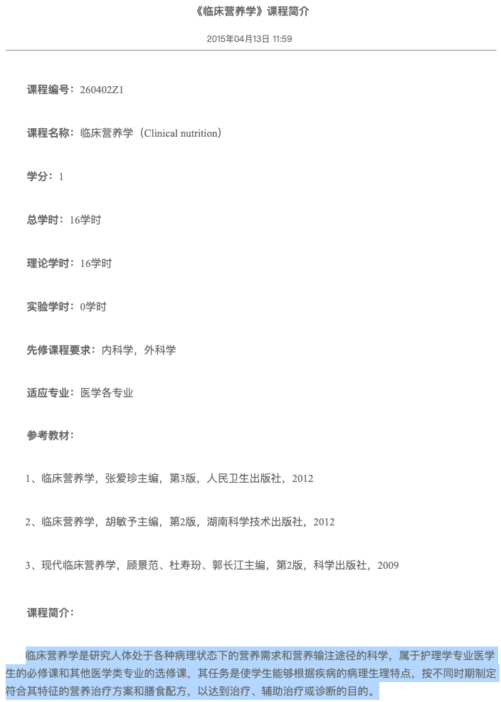 医者学无止境。但营养学和临床医学的交集在求学期间并不算太多。部分高校的临床营养学仅有护理学专业是必选。