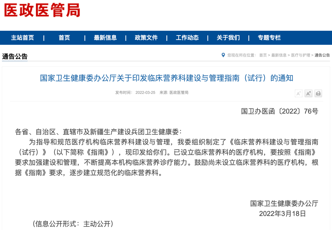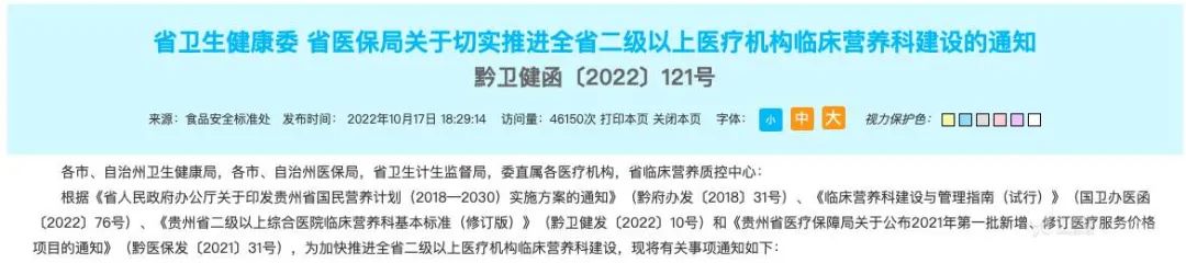 图源:贵州省卫生健康委贵州省的规定,也是对国家卫健委 3 月份发布的通知的响应。根据卫健委的文件内容,二级以上综合医院以及肿瘤、儿童、精神等专科医院,都推荐设立临床营养科并提高营养诊疗能力。