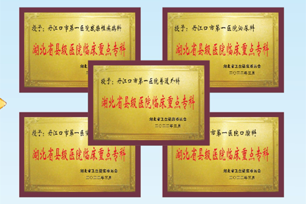 医院先后荣获「丹江口市最佳文明单位」、「十堰市消费者满意单位」、「十堰市文明单位」、「湖北省健康教育示范医院」、「湖北省改善医疗服务行动计划示范医院」、「湖北省文明单位」、「全国巾帼文明示范岗」、「全国基层医院院内感染控制先进单位」、「全国百姓放心百佳示范医院」等荣誉称号。
