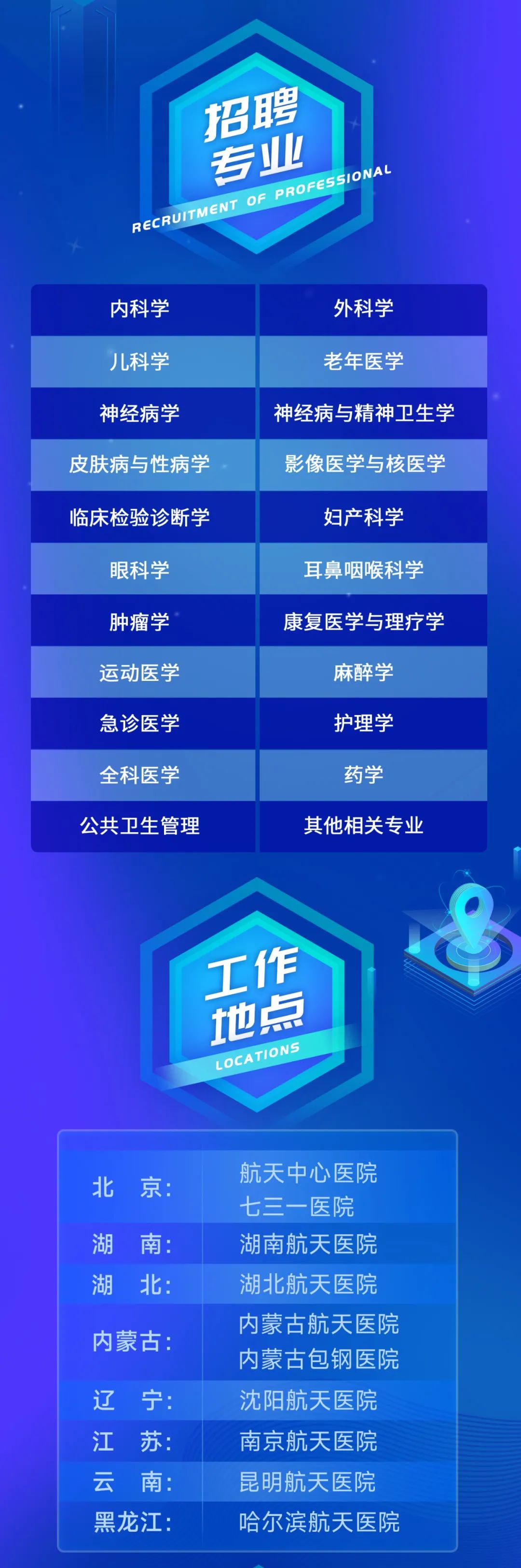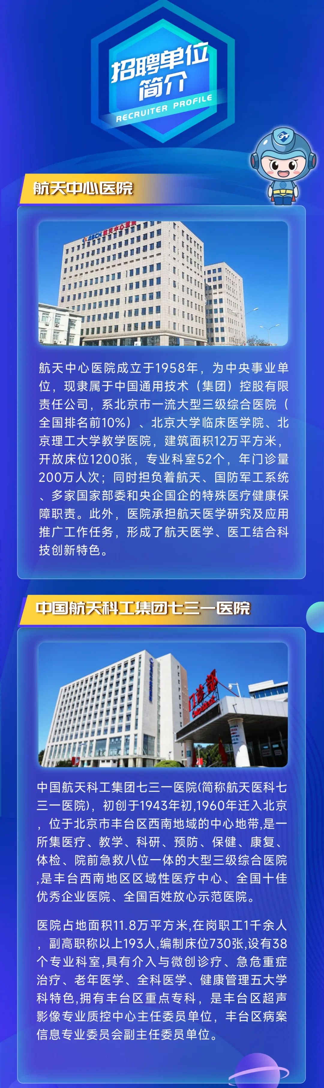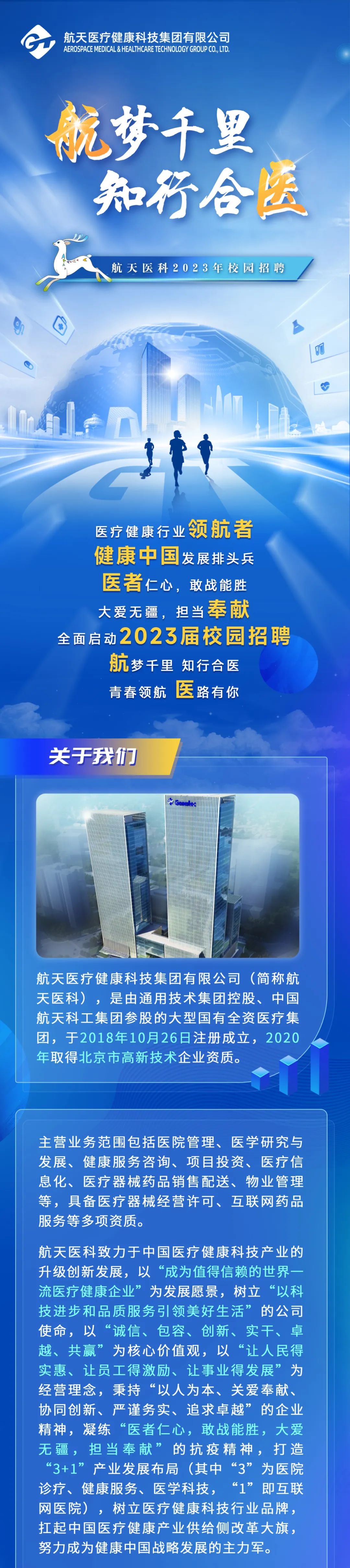 航梦千里 知行合医丨航天医科 2023 年校园招聘正式启动日期:2022-11-14 来源:丁香人才公众号 丁香人才投递入口 航天中心医院 七三一医院 湖南航天医院 湖北航天医院 内蒙古航天医院 内蒙古包钢医院 除丁香人才投递入口外 请至通用技术招聘官网、航天医科招聘官网 进行更多岗位查询 图片来源:航天医疗健康科技集团微信扫一扫分享资讯上一篇:本硕博均招 | 卫健委直属三甲医院多岗招聘下一篇:招 46 人 医技护等多岗招聘 | 公立医院诚聘英才