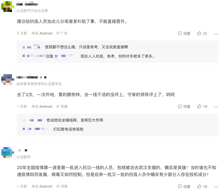部分医院会对高级职称的报名参评总人数设定限制,免考直评会挤占本已有限的名额,进而让没有抗疫加分的医生们面临更加激烈的竞争。
