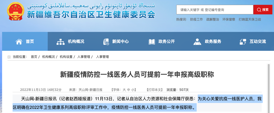 11 月 13 日,新疆人力资源和社会保障厅发布通知,为关心关爱抗疫一线医护人员,在 2022 年卫生健康系列高级职称评审工作中,疫情防控一线医务人员可提前一年申报职称。