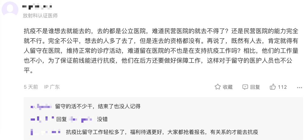 民营医院的医生想要支援但机会相对有限,也使得部分医生感到不满。