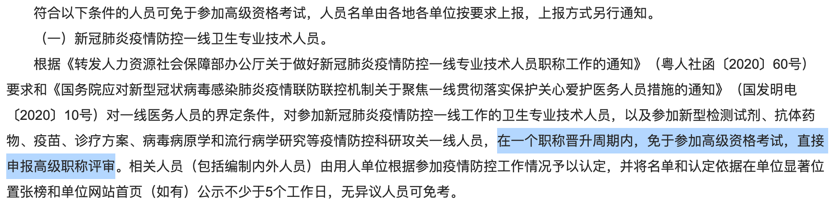 图源:广东省卫生健康委而同样有免考参评资格的,还有参与援建和扶贫的专业技术人才等,援派期满一年即可免试,但没有提及是否只限一个晋升周期内适用。