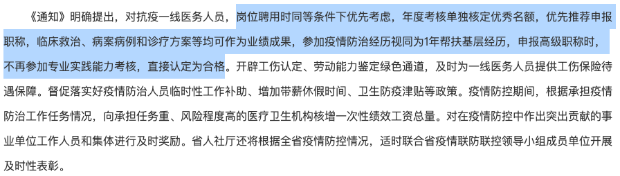 除了高级职称专业实践能力免考之外,还包括同等情况下优先聘用、给予单独考核的优秀名额等,并且,疫情防治的经历可等同为一年帮扶基层经历等。