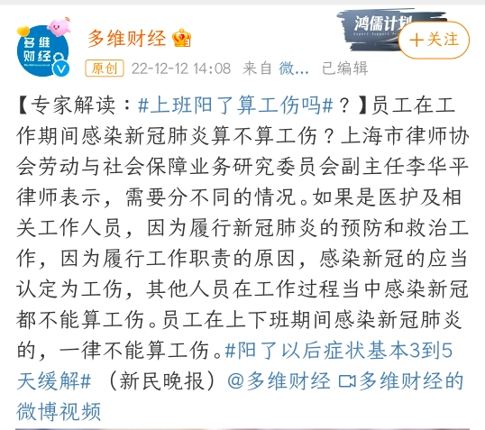 截图来源:多维财经微博医务人员感染新冠算工伤 但很难被认定