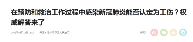 截图来源:温州市中级人民法院 在新冠肺炎预防和救治工作中,医护及相关工作人员因履行工作职责,感染新冠肺炎的,认定为工伤,医护及相关工作人员依法享受工伤保险待遇。已参加工伤保险的上述工作人员发生的相关费用,由工伤保险基金和单位按工伤保险有关规定支付;未参加工伤保险的,由用人单位按照法定标准支付。