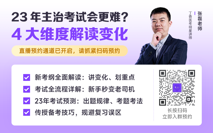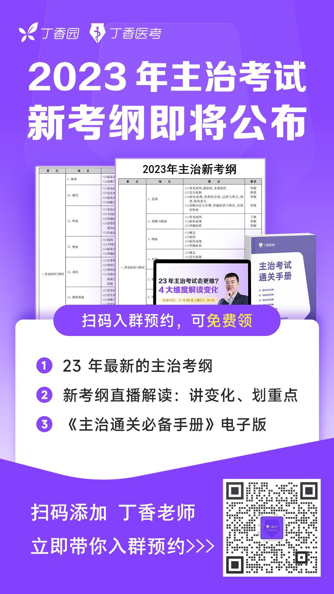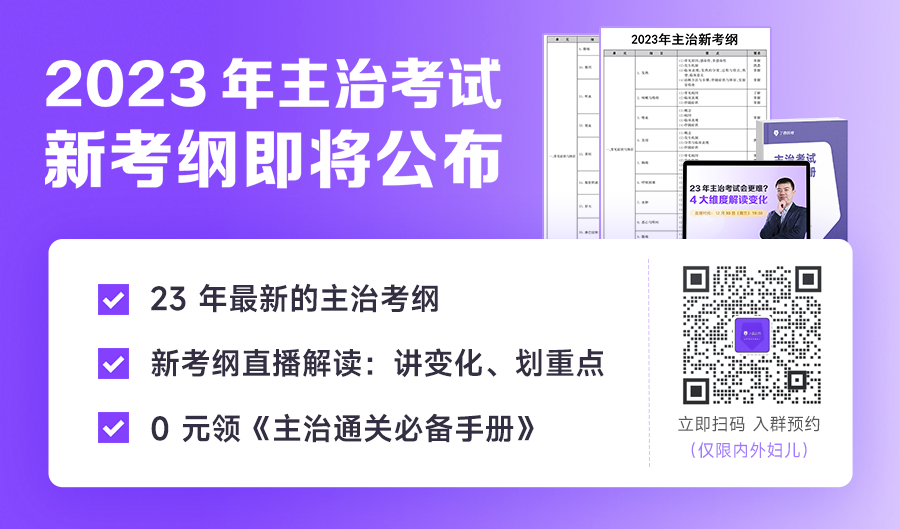 现在考纲的预约通道已经开启了,扫描下方二维码入群预约,就能第一时间免费领取 2023 年主治最新大纲,同时,还能免费预约新考纲的直播解读,带你划重点,高效复习。