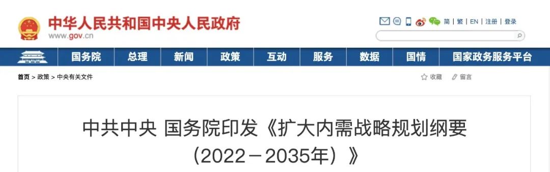 最近,中共中央、国务院近日印发《扩大内需战略规划纲要(2022-2035 年)》。
