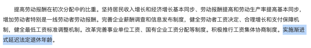 完善企业薪酬调查和信息发布制度,健全劳动者工资决定、合理增长和支付保障机制,健全最低工资标准调整机制。改革完善事业单位工资、国有企业工资分配等制度。积极推行工资集体协商制度。实施渐进式延迟法定退休年龄。
