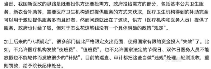 医改专家徐毓才曾就此说过:目前的巡查、审计都把「夜班费、值班费」等当做「违规」处理,轻则没收,重则罚款,给予院长纪律处分。