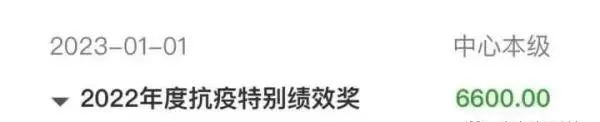 2023 年新年伊始,她收到了两笔与抗疫相关的奖金,分别是 1 到 11 月抗疫补贴 5500 元,新冠疫情激励保障 9000 元,累计到账 14500 元。