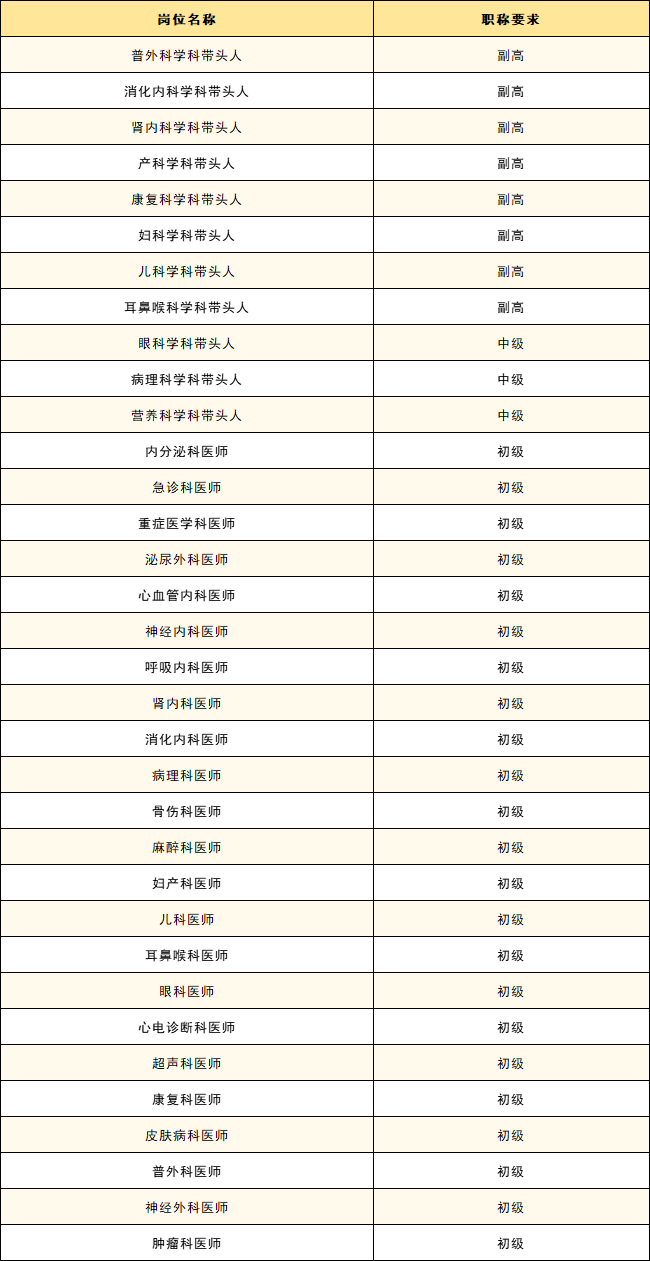 (三)原则上初级职称年龄不超过 35 岁,中级职称年龄不超过 40 岁,副高职称年龄不超过 45 岁。学科带头人需具有二级甲等及以上医院相关工作经历,具有相关管理工作经验。