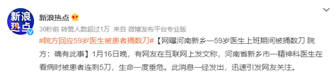 据新浪热点报道,1 月 16 日晚,河南新乡一 59 岁精神科医生上班期间被患者刺数刀。院方确认确有此事,具体情况正在调查中。