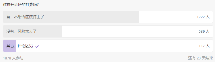 园子里发起了「是否有开诊所打算」的投票,共有 1878 人参与其中。其中 65% 的同行表示想从医院离职去开办诊所,也有近三成同行认为风险太大,不准备尝试。