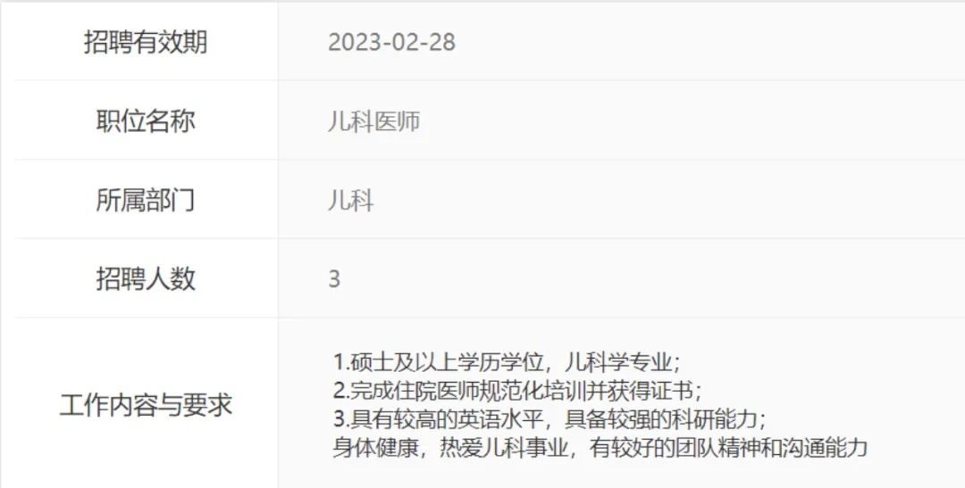 复旦大学附属华山医院 2023 年度招聘启事已发布,医师岗位均要求取得规培合格证书,且对学历做出限制,以紧缺专业儿科为例(要求如图所示),不仅对规培、学历做出限制,而且还要求具备较高的英语及科研能力。