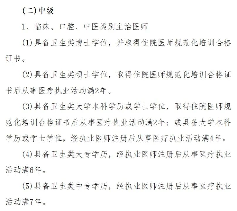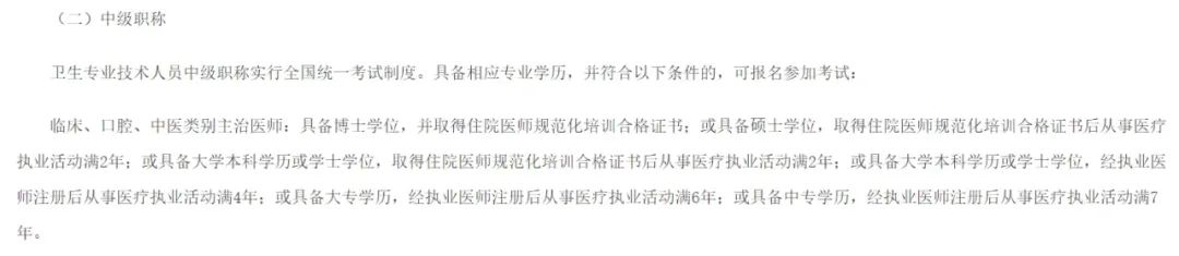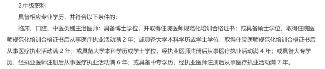 据 2022- 12- 28 委人事处发布的《关于 2023 年度卫生专业技术资格考试有关问题的通知》(卫考办发〔2022〕1 号),在文件中我们可以看到报考临床中级职称的要求:对于没有取得规培合格证的住院医师,中专、大专、本科学历依次需要执医注册后从事医疗执业活动满 4 年、6 年、8 年;对于取得规培合格证书的医师,本科及硕士学位均需要取得规培合格证后从事医疗执业活动满 2 年,博士学位则无工作年限要求。