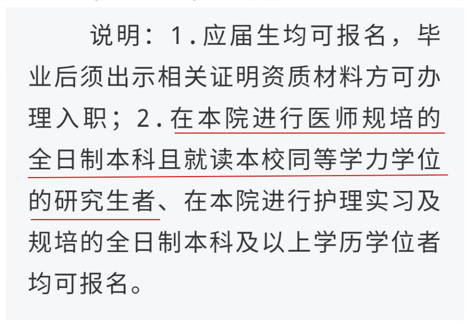在上海市卫健委的官网上一直未找到「两个同等对待」政策相关文件,在查阅各大医院的招聘细则中,很多医院将求职者的学历门槛设在硕士,可以看出规培生在求职过程中明显处于劣势地位。