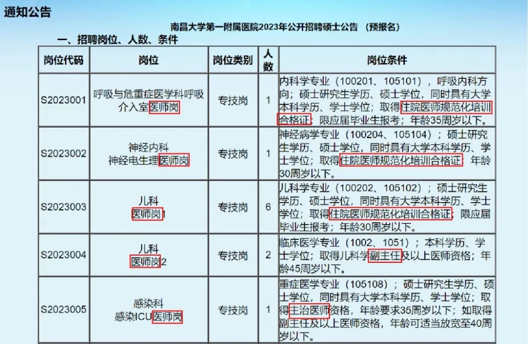 以江西省省内龙头医院——南昌大学第一附属医院 2023 年的招聘条件为例,绝大多数医师岗明确规定需要规培合格证,仅部分招收主治及以上职称的岗位未对规培证做出要求;