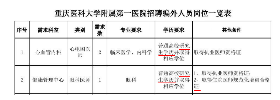 截图来自:西南医院官方公众号 而在重庆大学第一附属医院发布的最新招聘信息中,并没有找到取得非全日制研究生学历的规培生是否能报考的信息,对学历明确要求为研究生学历,而部分偏医技的职位对规培证并未做强制要求。