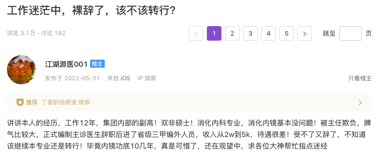 图源:丁香园论坛 点击图片查看原帖详情辞职后我进了省级三甲,成了编外人员,收入从 2w 到 5k,待遇很差!我身心疲惫不堪,不想再继续当廉价劳动力了,所以果断辞职。