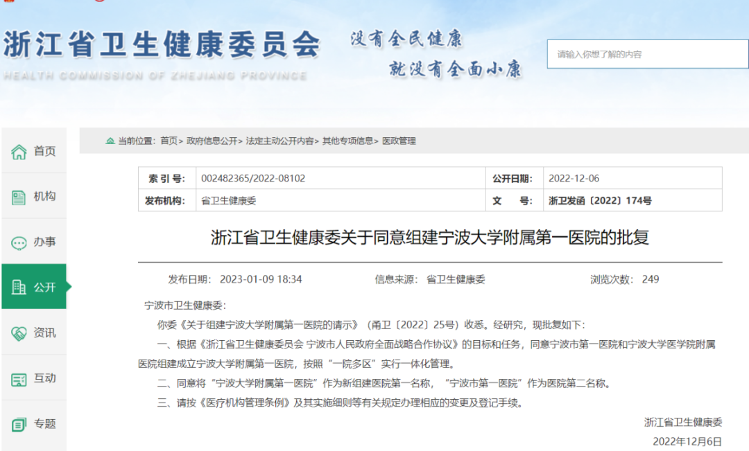 2022 年 12 月 6 日,浙江卫健委发文:同意宁波市第一医院和宁波大学医学院附属医院组建成立宁波大学附属第一医院。