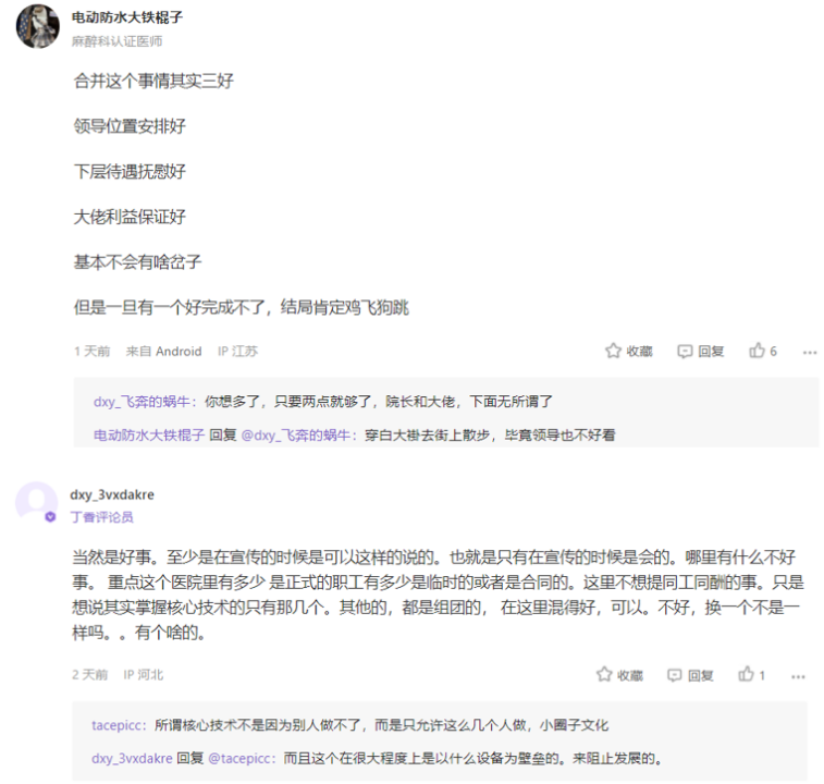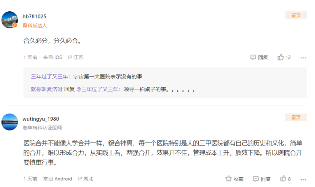 >>点此查看公立医院最新招聘>>点此查看民营医院最新招聘丁香园站友熊鸡胸 Jason 就此事在论坛发帖与网友一起讨论,那么问题来了——医院合并,到底是好事还是坏事? 众多站友的看法也是意见不一。