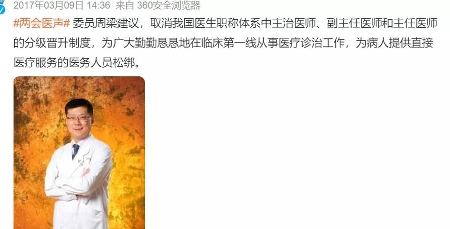 前两年「两会」期间,全国政协委员、主任医师、复旦大学附属眼耳鼻喉科医院耳鼻喉科主任周梁教授提出:取消我国医生职称体系中主治医师、副主任医师和主任医师的分级晋升制度,为广大勤勤恳恳地在临床第一线从事医疗诊治工作,为病人提供直接医疗服务的医务人员松绑。