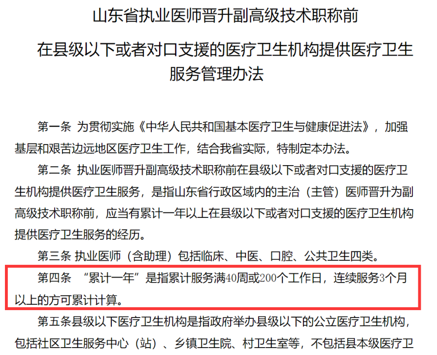 其中一条与晋升息息相关——山东省行政区域内的主治(主管)医师晋升为副高级技术职称前,应当有累计一年以上在县级以下或者对口支援的医疗卫生机构提供医疗卫生服务的经历。