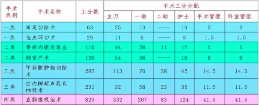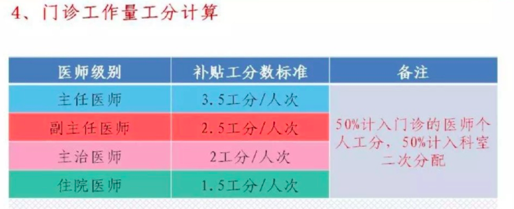 以三明市将乐县医院为例,医院从职称、工龄、手术所需人数、门诊所需医生人数、住院工作量、夜班、请会诊、进修、急诊出车等多方面设置了不同的工分计算方式。