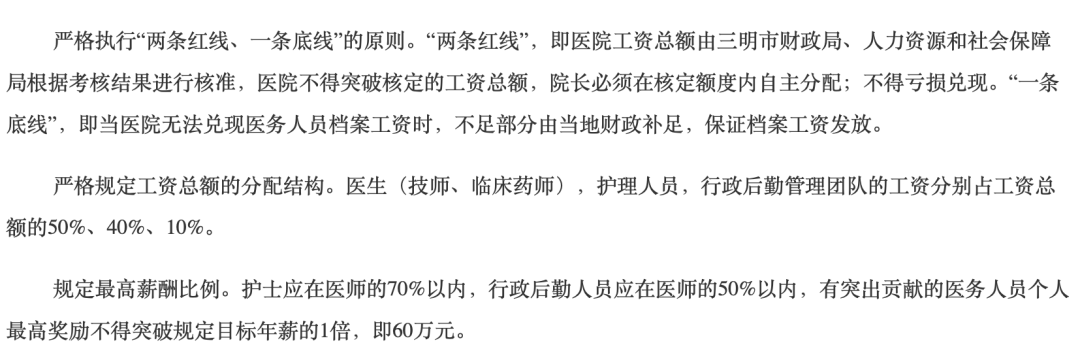 三明市政府表示, 医疗服务收入部分扣除运行成本后,80% 将用于发放工资。