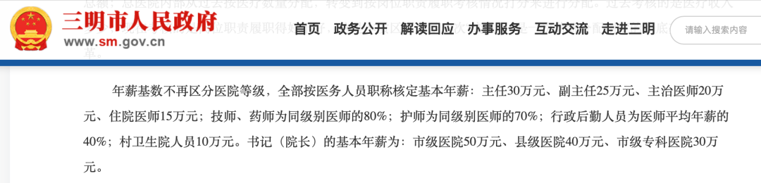 三明市人民政府公开的资料显示:年薪基数不再区分医院等级,全部按医务人员职称核定基本年薪: 主任 30 万元、副主任 25 万元、主治医师 20 万元、住院医师 15 万元。