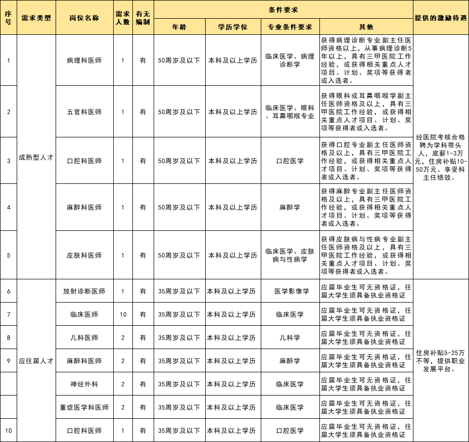 有执业医师资格优先入编,另有餐补、生日补贴、定期体检等福利,具体根据医院人才引进管理方案执行。