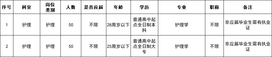 普通高中起点全日制大专毕业生 25 周岁以下,普通高中起点全日制本科毕业生 28 周岁以下,护理专业研究生 35 周岁以下。