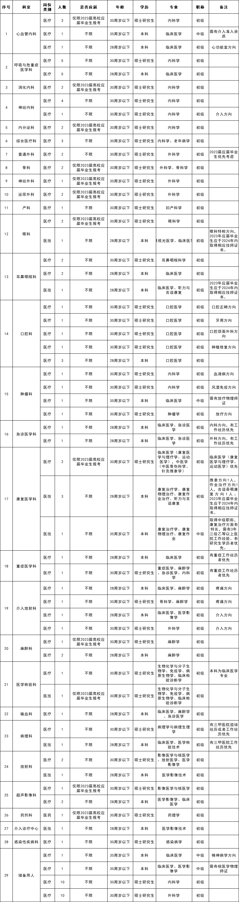 医师(医疗岗位)需具备执业医师证和规培证,原则上具有中级职称证不作规培要求,应届毕业生应于 2023 年 7 月 31 日前取得相应专业规培证,若遇上级延迟考试时间,则应于相应时间内取得,规培方向与岗位要求一致;