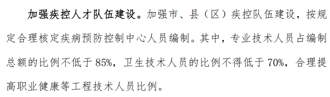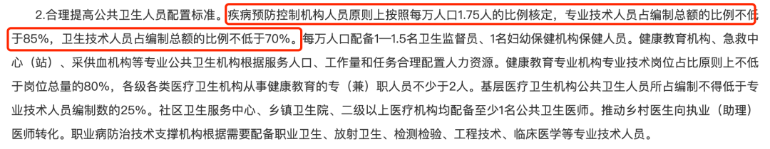 此前云南省也曾发文,合理提高公共卫生人员配置标准,疾病预防控制机构人员原则上按照每万人口 1.75 人的比例核定,专业技术人员占编制总额的比例不低于 85%,卫生技术人员占编制总额的比例不低于 70%。