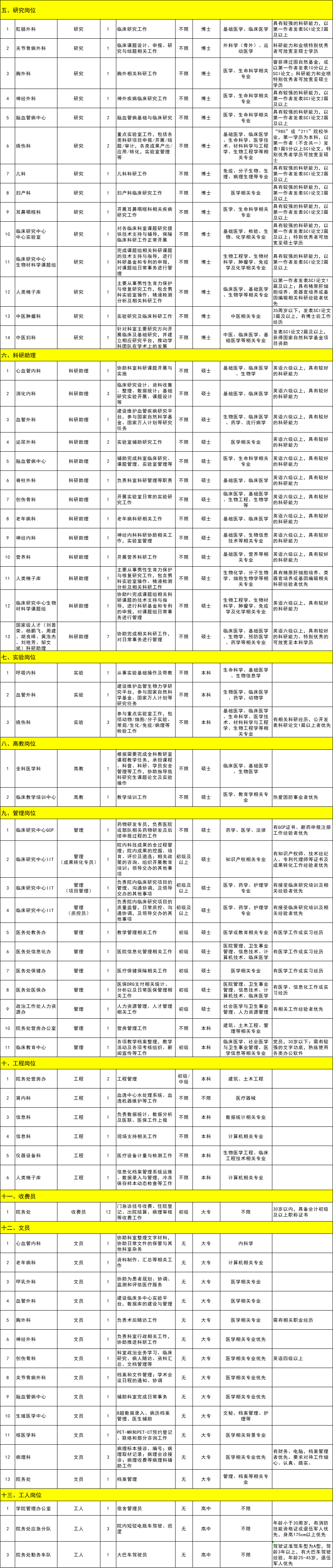 招聘岗位包含各科室医生、技师、药师、护士、教学人员、研究人员、科研助理、实验人员、工程人员、管理人员、文员、收费员等岗位。